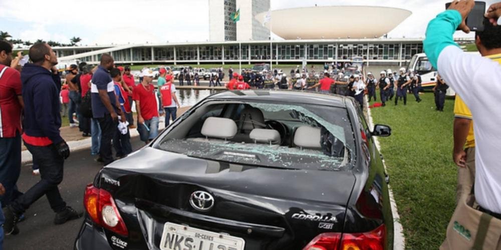Manifestantes que entraram em conflito com policiais militares (PM) no protesto contra o projeto de lei que amplia a terceirização, realizado pela CUT, MST, UNE