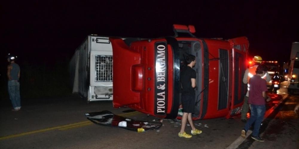 Uma carreta carregada de carne tombou na BR-153, no final da tarde de sábado 09/05, próximo ao Posto Barreto. Conforme informações divulgadas, o condutor da