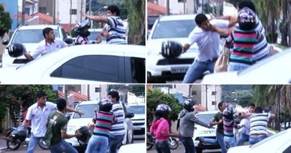 Dois homens foram flagrados durante uma discussão no trânsito na manhã desta quarta-feira (13) em Jataí, no sudoeste de Goiás.Eles se agridem fisicamente com capacete,