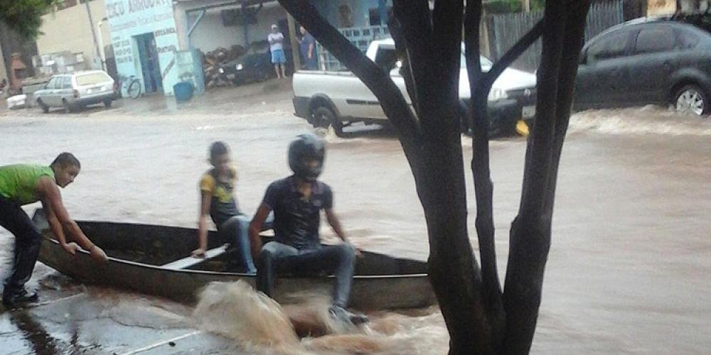 Em Itapaci, jovens usam canoa para navegar em rua alagada