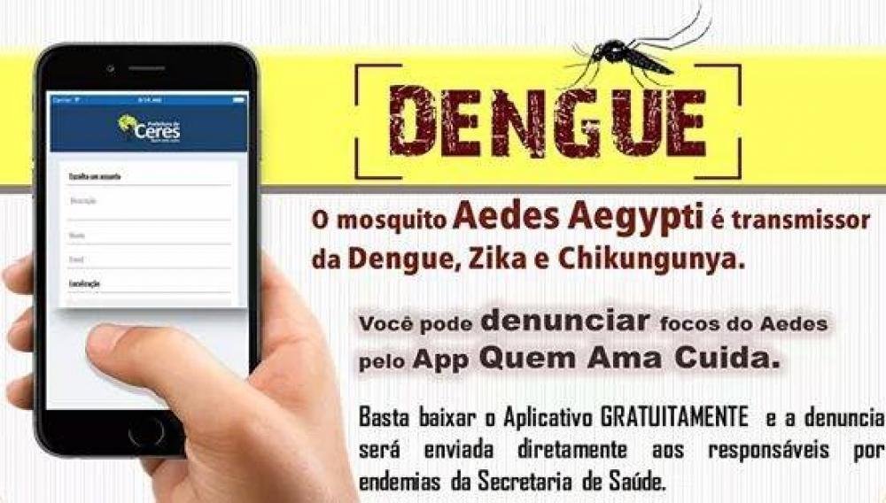 Para facilitar as denúncias relacionadas aos focos do mosquito da dengue [Aedes aegypti], o cidadão ceresino pode utilizar o aplicativo de celular “Quem Ama Cuida”; nele