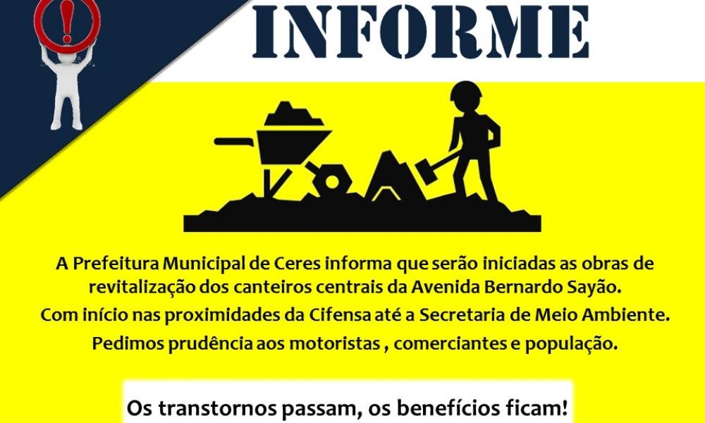 A prefeitura de Ceres informa que na próxima semana estará realizando revitalização dos canteiros centrais da Avenida Bernardo Sayão. Com início nas proximidades da Cifensa