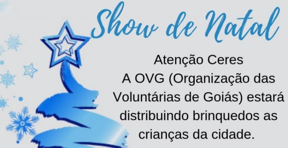 A Prefeitura Municipal de Ceres, Secretaria de Desenvolvimento Social, e OVG estarão realizando o show de Natal, com entrega de diversos brinquedos a nossas crianças.