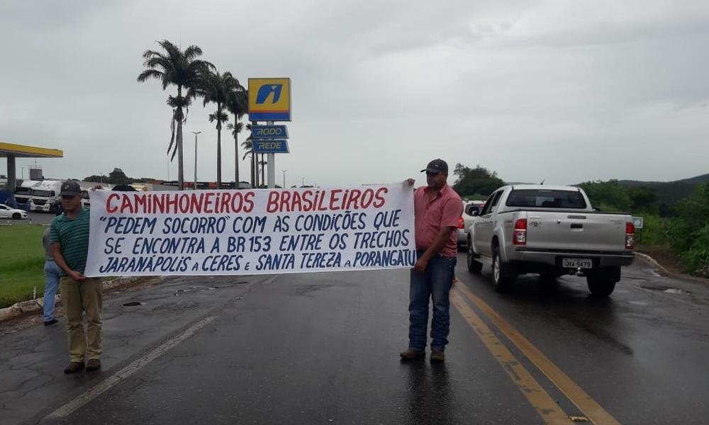 Nesta sexta-feira (11), um grupo de caminhoneiros interditou um trecho da BR-153, em Jaraguá. De acordo com a Polícia Rodoviária Federal (PRF), a categoria pede