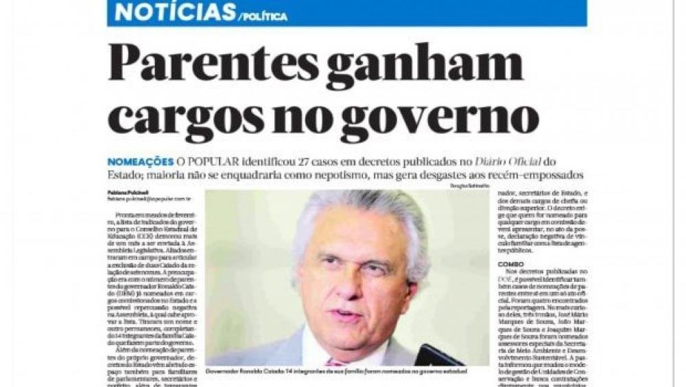 Em reportagem assinada pela jornalista Fabiana Pulcineli deste domingo 7 de abril, o jornal O Popular estampou manchete, sobre a familiocracia no governo de Ronaldo