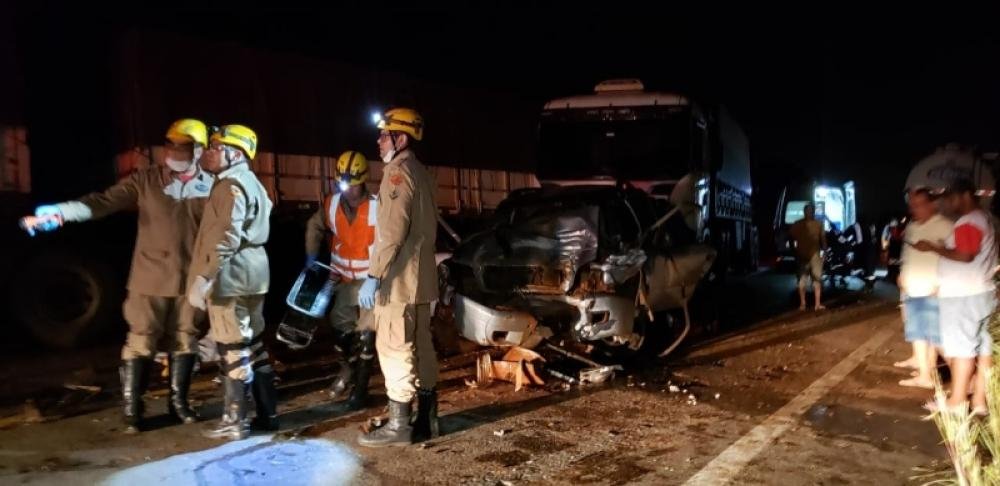 Cinco pessoas, sendo duas crianças de 2 e 5 anos, ficaram feridas, em um acidente envolvendo três caminhões e uma caminhonete, na noite de ontem