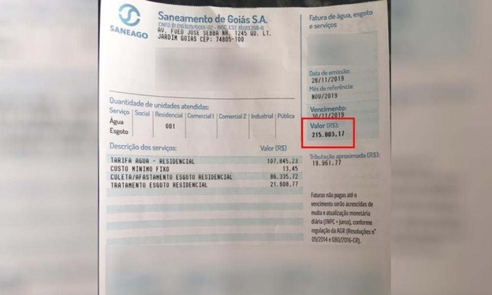 Um casal se surpreendeu ao pegar a conta de água do último mês de novembro, em Goiânia. O advogado Marco Aurélio Cruz e a professora