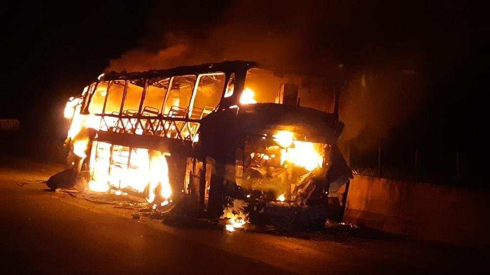 Um coletivo interestadual pegou fogo na noite desta segunda-feira (10), na rodovia BR-060, km 128, município de Goiânia e deixou a rodovia interditada no sentido