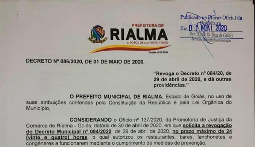 O prefeito de Rialma, Fred Vidigal, através do Decreto 086/2020 revogou o Decreto 084/2020 que autorizava o funcionamento de bares, lanchonetes e restaurantes. A medida,