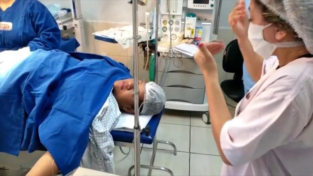 Gabriel Batista e Ligiane Souza são deficientes auditivos e tiveram o parto da primeira filha narrado pela intérprete de libras Lud Leides Silva. Tudo foi