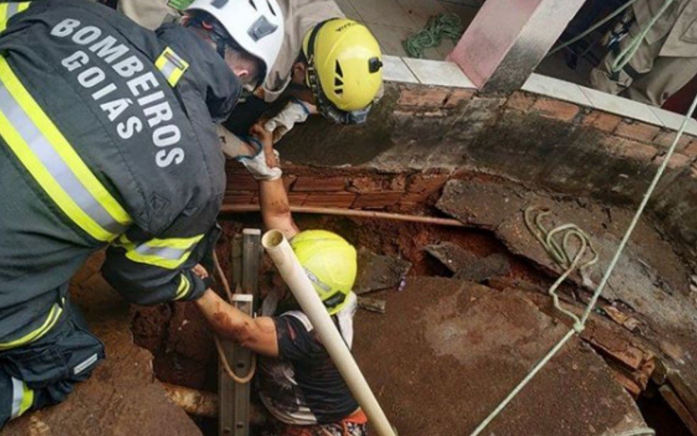 Uma equipe do Corpo de Bombeiros resgatou uma mulher de 34 anos que caiu dentro de uma fossa de cinco metros de profundidade na casa
