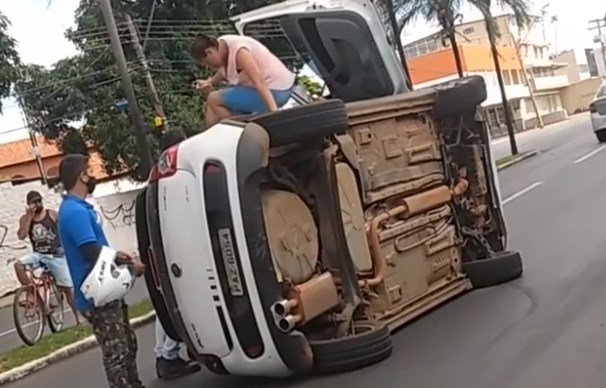 Um carro capotou na Avenida C-205, próximo à Praça Santos, no Jardim América em Goiânia. O veículo tombado interrompeu parcialmente o trânsito. Nas imagens, é possível