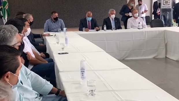 O prefeito de Goiânia Rogério Cruz (Republicanos), ao lado do prefeito de Aparecida de Goiânia, Gustavo Mendanha (MDB) e do governador Ronaldo Caiado (DEM) anunciou
