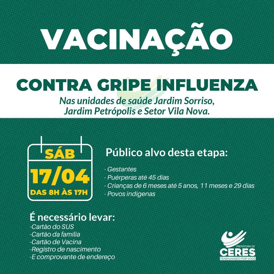 Neste sábado, 17, a Secretaria Municipal de Saúde de Ceres iniciará uma campanha de imunização contra a gripe Influenza. A gripe Influenza e a COVID-19