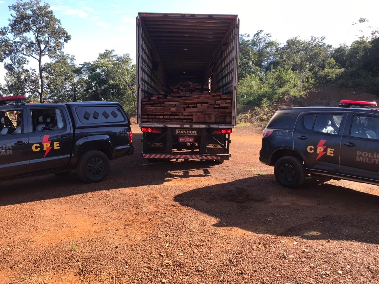 Carreta carregada de madeira sem nota fiscal foi apreendida pela equipe de Companhia de Policiamento Especializado (CPE) Anápolis, nesta quarta-feira (14), na zona rural do
