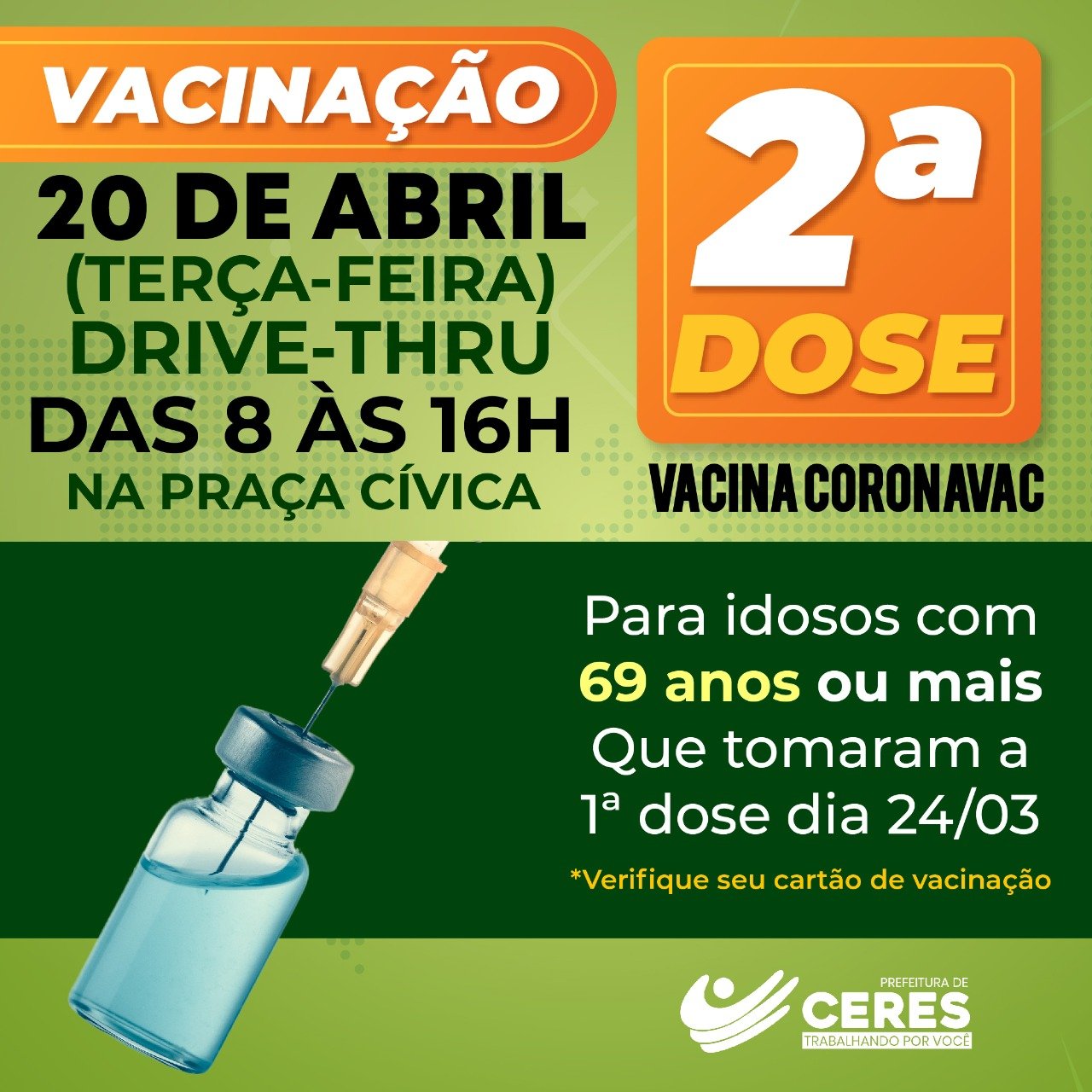 A vacinação é exclusiva para os idosos de 69 anos ou mais que vacinaram a 1ª dose no dia 24 de março com a vacina CORONAVAC