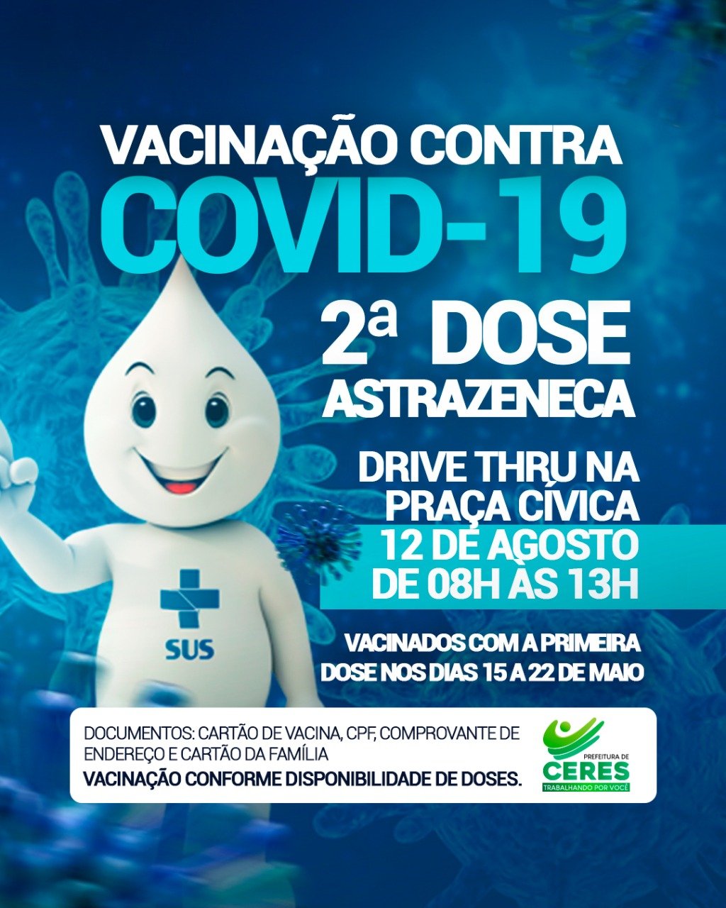 A administração de Ceres realiza nesta quarta-feira (12), a vacinação da 2ª dose contra a Covid-19 para pessoas que vacinaram a 1ª dose entre os