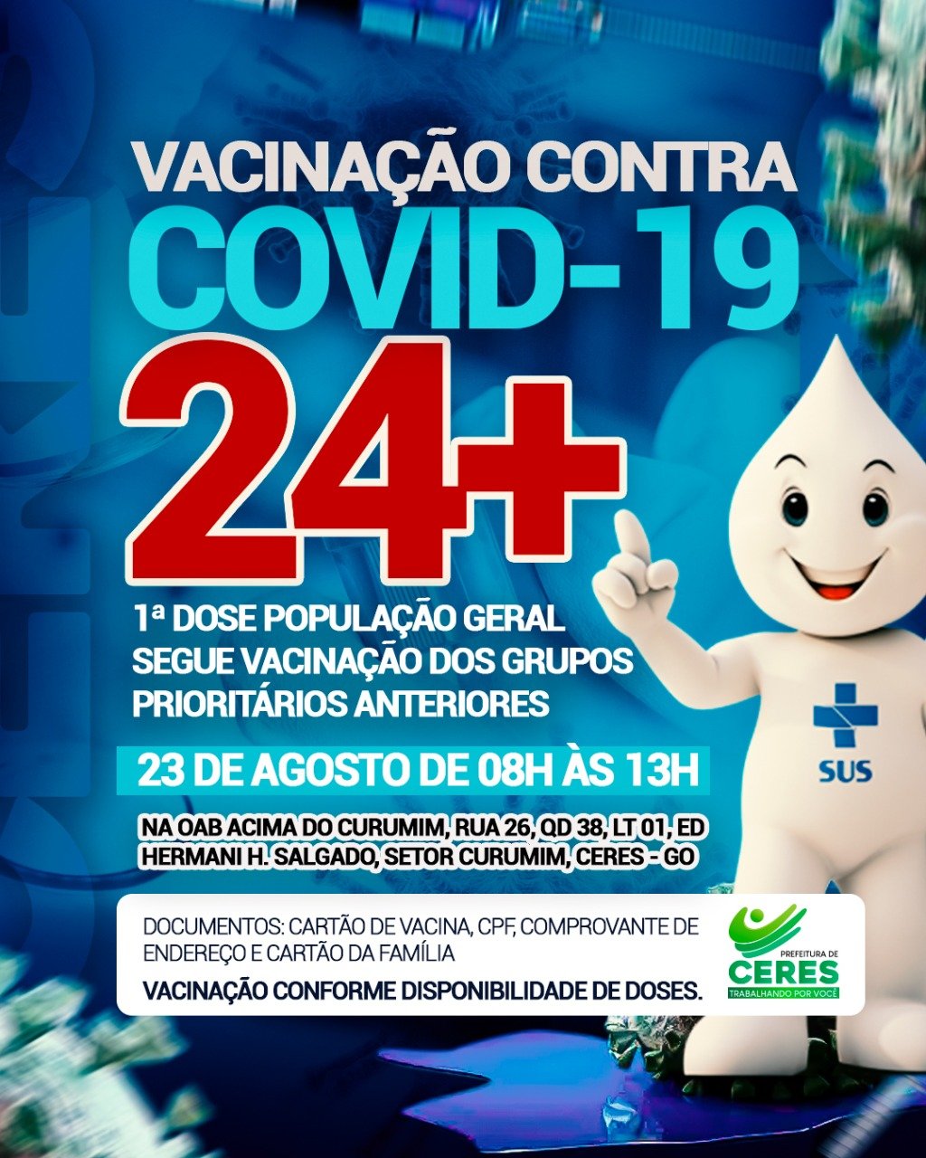 A administração de Ceres vai realizar a vacinação da 1ª dose contra Covid-19 da população geral 24+. Serviço Local: OAB próximo do Parque Curumim