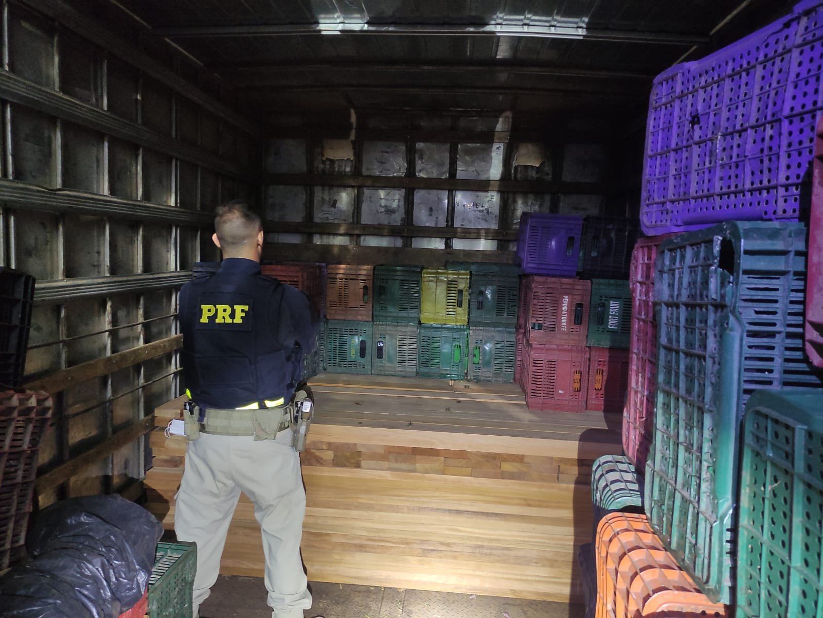 O caminhão saiu de Anapu (PA) com destino a Anápolis (GO). A madeira estava escondida debaixo caixas de verduras vazias.