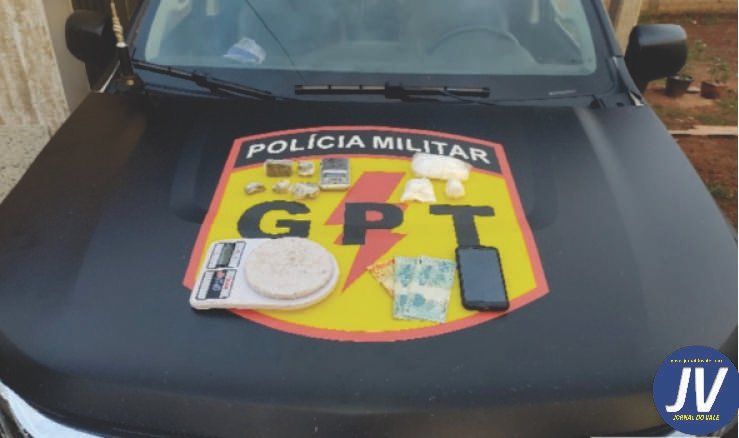 Foram apreendidas cinco porções de maconha, duas porções grandes de cocaína, uma balança de precisão, dinheiro em espécie e um celular.