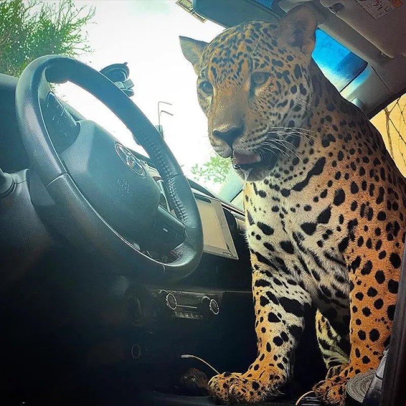 O profissional publicou em suas redes sociais o momento em que abre a porta do veículo e se depara com o animal dentro de seu veículo.