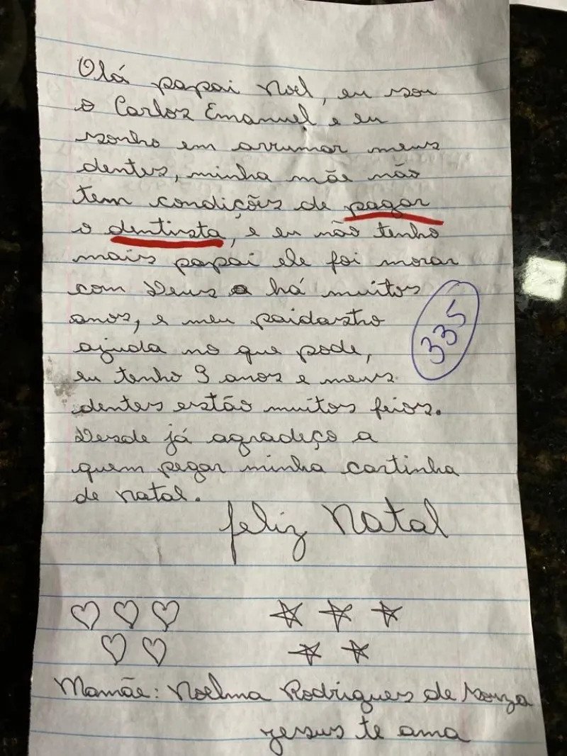 A cartinha do garoto foi lida durante uma live, e uma odontóloga que acompanhava a transmissão se ofereceu para cuidar do tratamento da criança.