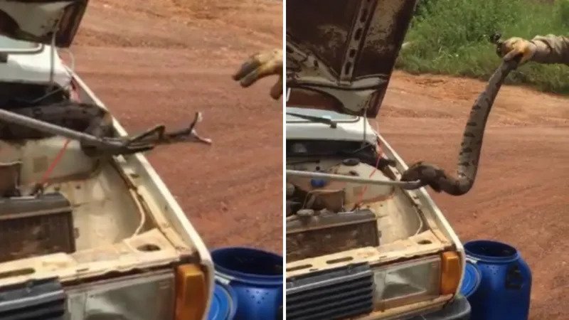 Corpo do Bombeiros é acionado por motorista que encontrou cobra enrolada no motor após ouvir barulho estranho ao ligar veículo