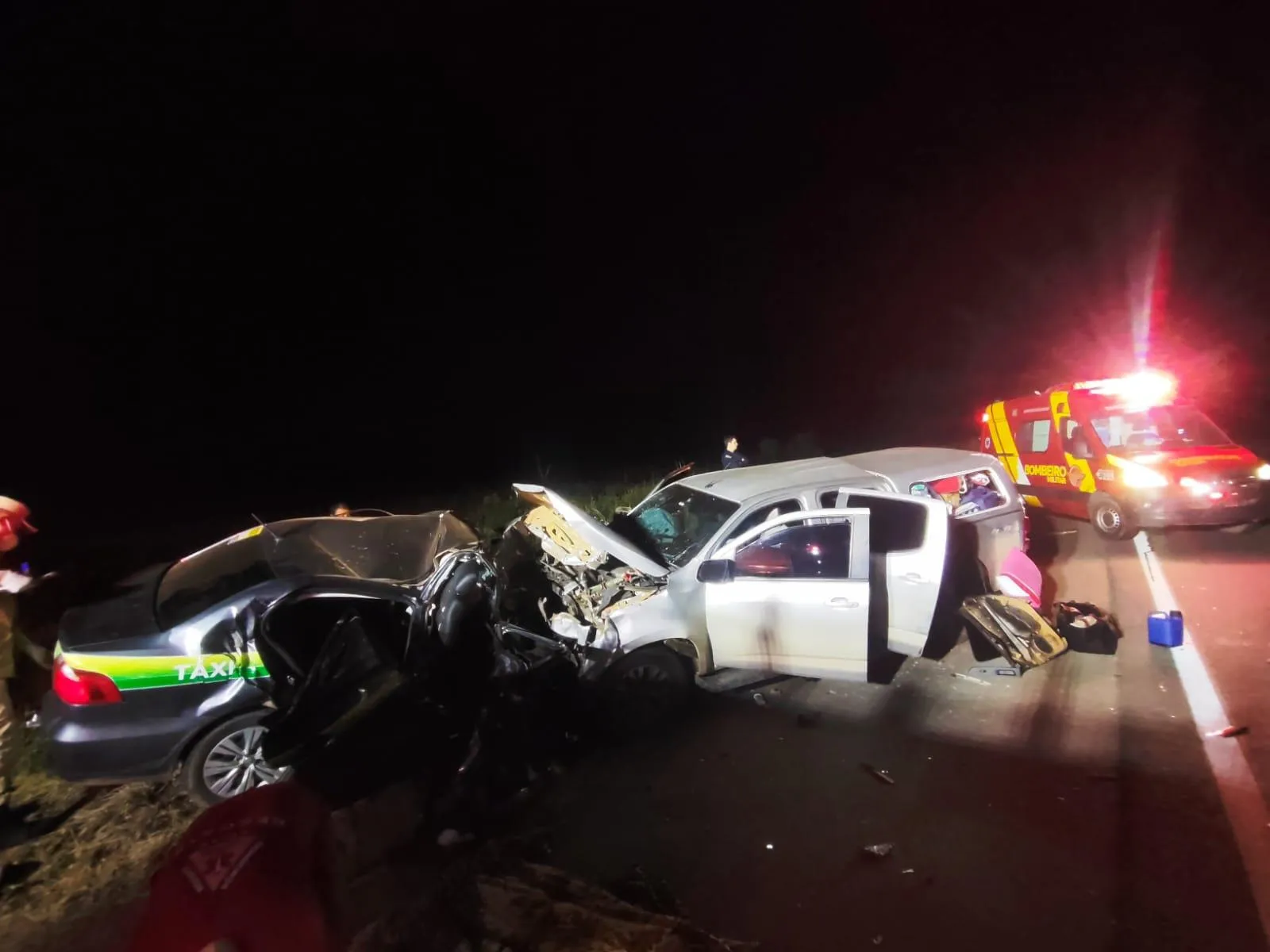 Conforme o Corpo de Bombeiros, outras cinco pessoas ficaram feridas. A colisão envolveu um táxi e uma picape.