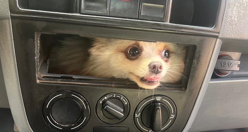 As imagens mostram o animal de pequeno porte com o focinho para fora do buraco onde ficava o som do carro.