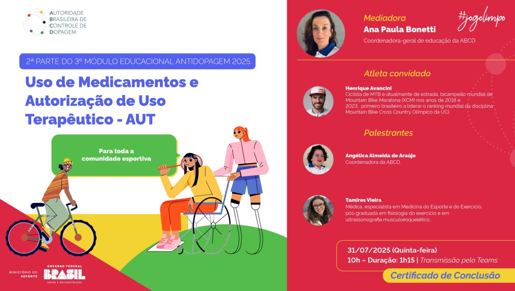 A Autoridade Brasileira de Controle de Dopagem (ABCD) realiza, nesta quinta-feira (31), a 2ª parte do 3º Módulo Educacional Antidopagem de 2025. Com o tema