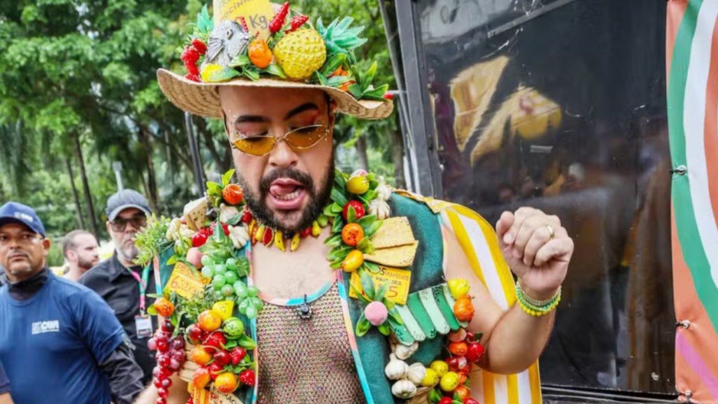 Tiago Abravanel, de 38 anos, lidera neste sábado (7), o Bloco do Abrava, na Vila Olímpia, no circuito dos blocos de rua de São Paulo.