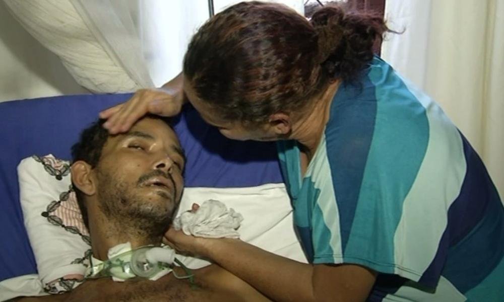 O homem está em uma maca há mais de dois meses, não fala e depende da mãe, a dona de casa Edileuza Vieira de Souza, para realizar todas as atividades.