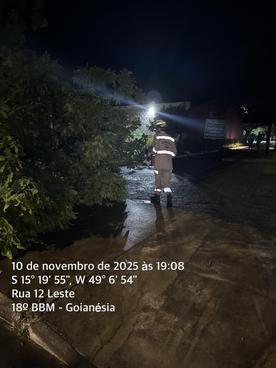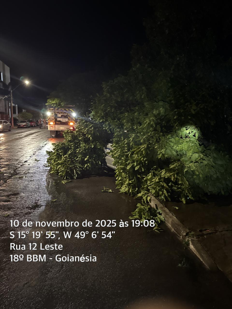 Na noite desta segunda-feira (10), o Corpo de Bombeiros Militar do 8º CRBM – 18º BBM de Goianésia, no Vale do São Patrício, foi acionado para uma ocorrência de busca e salvamento envolvendo uma árvore de grande porte que caiu sobre dois veículos na esquina da Rua 12 com a Rua 31, no bairro Centro. A queda da árvore foi provocada pelos fortes ventos que precederam as chuvas no início da noite.