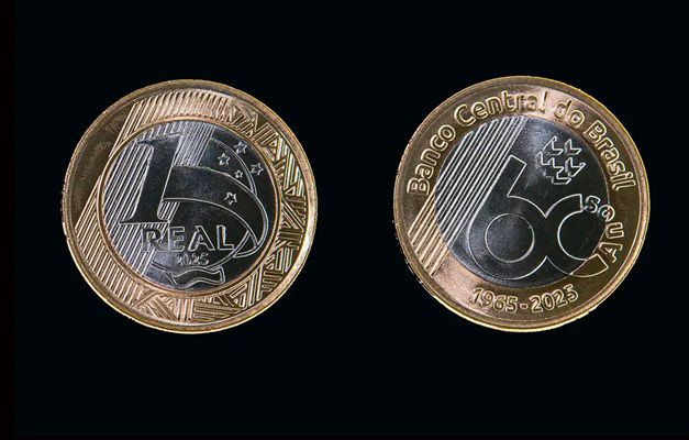 No anel dourado, aparecem as legendas “Banco Central do Brasil” e “1965–2025”. O reverso (parte de trás) seguirá o padrão da segunda família das moedas do tipo, em que aparece o valor de face de R$ 1.