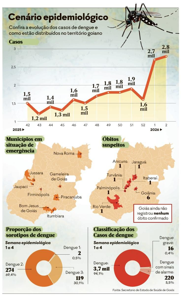 Os casos de dengue em Goiás começaram a crescer nas duas primeiras semanas de 2026, com maior concentração na região Centro-Sul do estado. Entre a última semana epidemiológica de 2025 e a primeira de 2026, as notificações saltaram de 1,6 mil para 2,7 mil, um aumento de 65,9%. Ao todo, o estado já soma 5,5 mil casos nessas semanas, número semelhante aos 5,6 mil do mesmo período em 2025, segundo a Secretaria de Estado da Saúde de Goiás (SES-GO). O InfoDengue, da Fundação Oswaldo Cruz (Fiocruz), prevê incidência cumulativa similar à de 2025, mas superior à média de 2019-2023. Oito municípios estão em emergência, e 12 óbitos seguem em investigação, metade em Goiânia.
