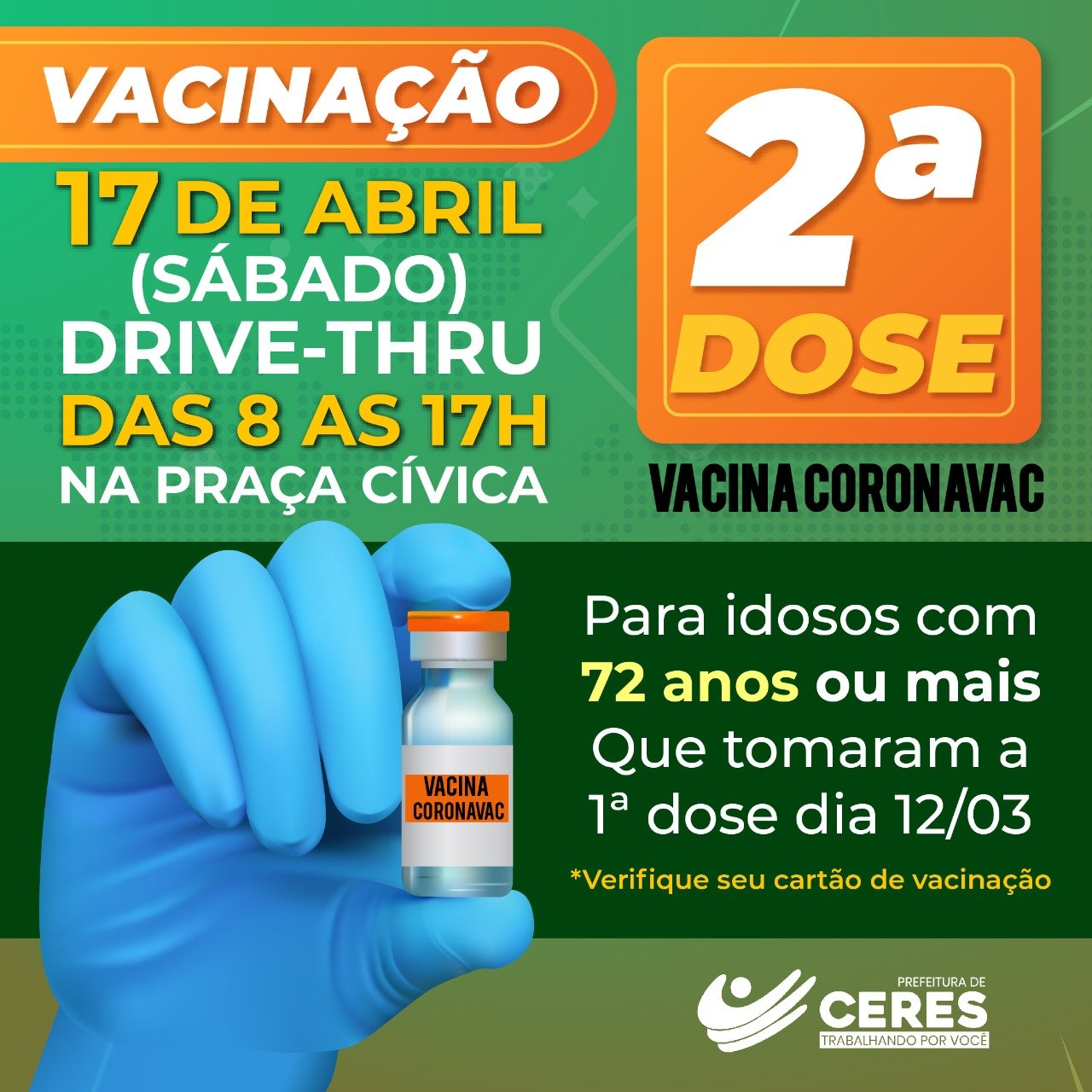 A Secretaria Municipal da Saúde de Ceres convoca todos os idosos com 72 anos que tomaram a 1ª dose da vacina Coronavac no drive thru do dia 20 de março para tomar a segunda dose da vacina, neste sábado (17). A vacinação será feita das 8h às 17h, na Praça Cívica, em frente à Prefeitura.