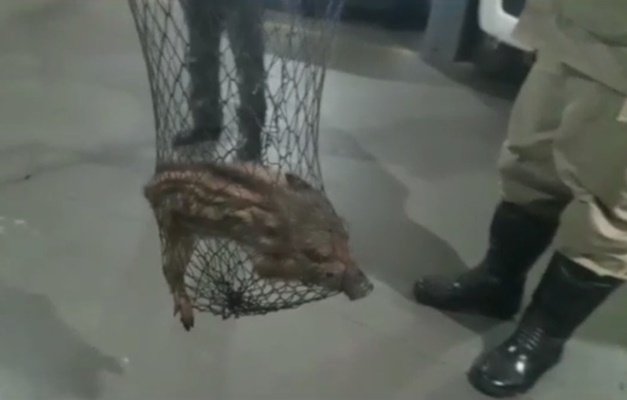 Um filhote de javali foi encontrado no estacionamento de um edifício residencial, no Setor Oeste, em Jataí, na noite desta terça-feira (27) por volta das 19h30.