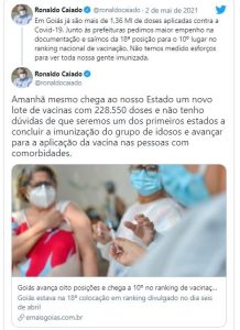Ainda segundo ele, Goiás já aplicou mais de 1,36 milhões de doses contra o novo coronavírus. “Junto às prefeituras pedimos maior empenho na documentação e saímos da 18ª posição para o 10º lugar no ranking nacional de vacinação. Não temos medido esforços para ver toda nossa gente imunizada.”