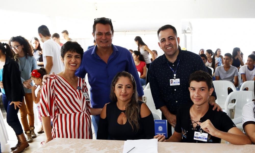 SBetânia Brito/Assistente Social da CRV Industrial, Delson José Santos/Prefeito Municipal e Estêvão Costa/Coordenador da RENAPSI, acompanham a Assinatura do Contrato de Aprendizagem, em solenidade realizada no Centro de Referência e Assistência Social-CRAS de Carmo do Rio Verde em março de 2018