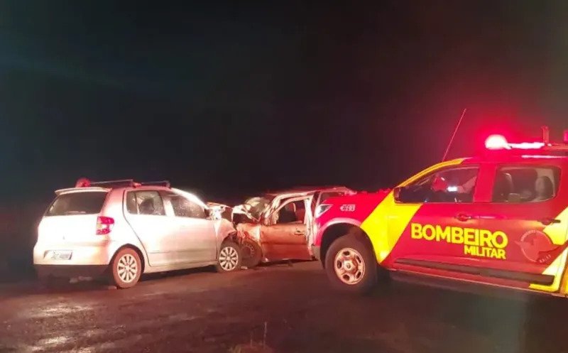 Um acidente entre dois carros de passeio deixou duas pessoas mortas e uma ferida na noite deste sábado (31) na rodovia GO-319, em Quirinópolis. A foto mostra que os dois veículos bateram de frente.