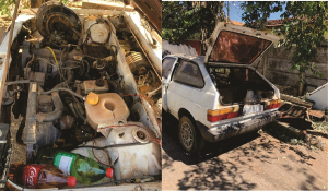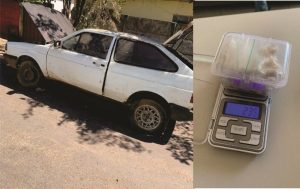 O policial penal, ao ser alertado pelos detentos, verificou o compartimento do motor do Gol e encontrou duas embalagens contendo substâncias petrificadas, possivelmente crack. Assim, ele acionou a equipe da PM.