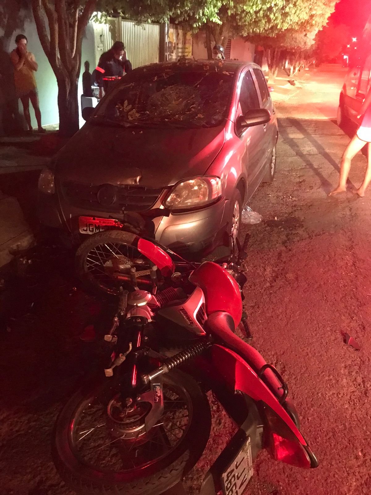 O Corpo de Bombeiros foi acionado para atender ocorrência de acidente de trânsito envolvendo um carro e uma motocicleta. A motocicleta veio a colidir com o carro estacionado.