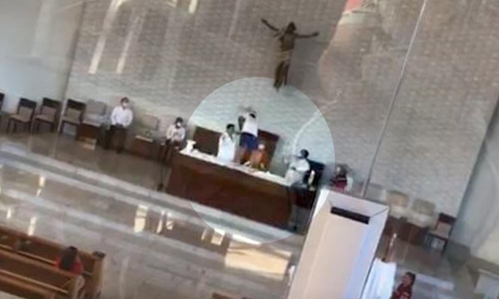 Um vídeo realizado por celular mostra um homem agredindo fiéis e religiosos no altar de uma igreja católica em Goianésia. A imagem capturada do vídeo, aparece o homem em pé sobre a mesa e dá tapas nas pessoas e arremessa uma bíblia no chão até ser imobilizado e retirado do local.