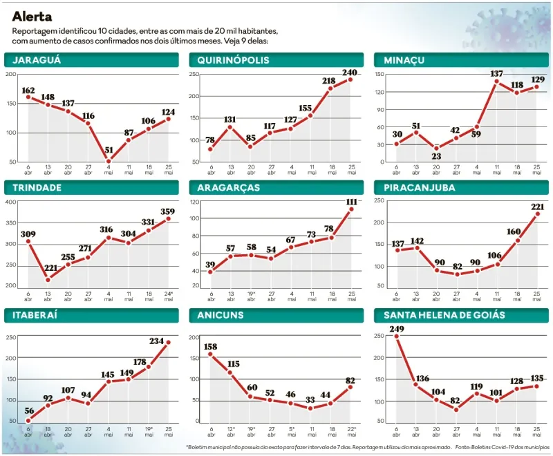 Um levantamento por semana, dos dois últimos meses, nos sites e redes sociais das prefeituras das cidades com mais de 20 mil habitantes, que são 61 no total. Dez delas tiveram aumento de casos ativos pelo menos nas duas últimas semanas e/ou curva ascendente ao se montar um gráfico de linha com os dados. São elas Trindade, Jaraguá, Quirinópolis, Itaberaí, Aragarças, Santa Helena de Goiás, Minaçu, Piracanjuba, Anicuns e a Cidade de Goiás.