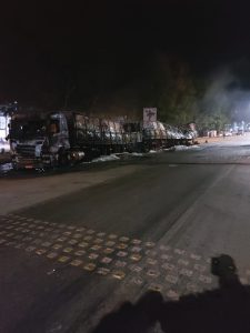 Um incêndio de grandes proporções atingiu três caminhões em um posto de combustível no início da noite desta quinta-feira (7), em Nerópolis. O fogo começou em um caminhão carregado com nove toneladas de gás de cozinha e depois se espalhou para outros dois caminhões.