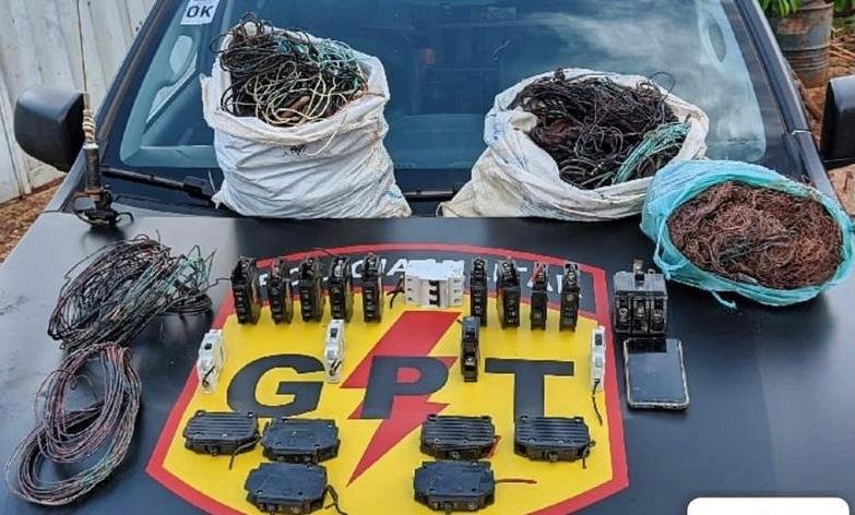 Conforme a PM, foram detidos três indivíduos e realizada a apreensão de 21 disjuntores de energia e vários quilos de fio de energia que já haviam sido queimados e vendidos.