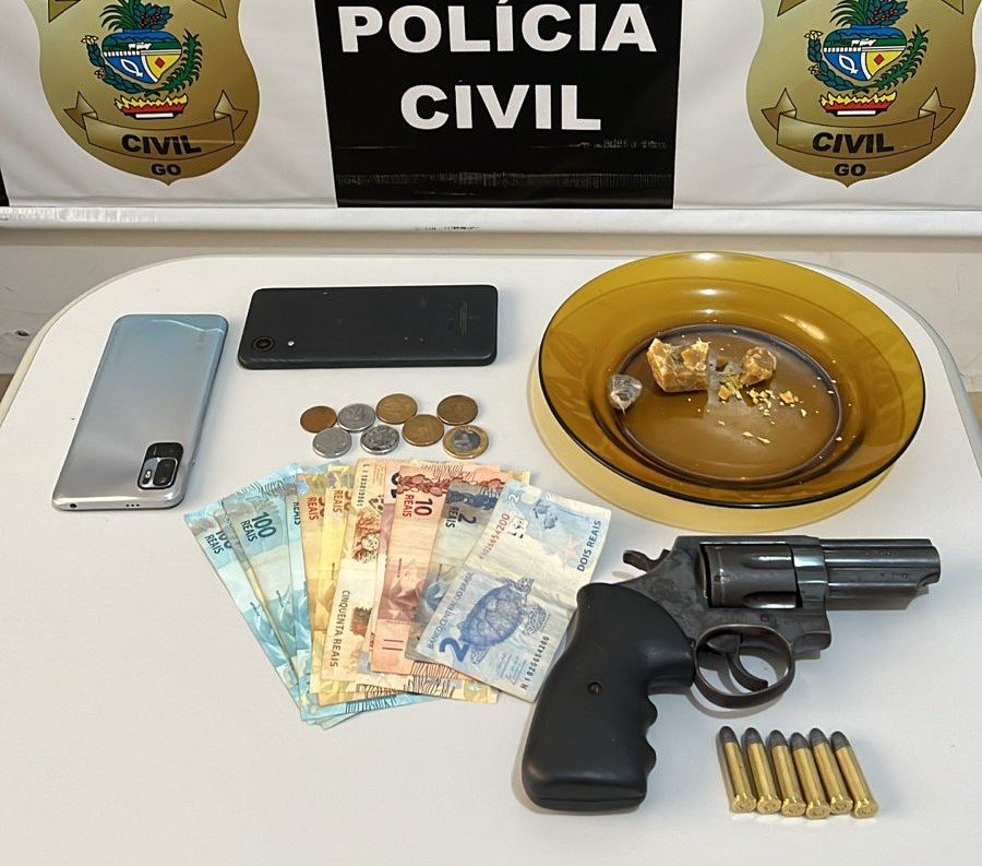 Assim, as equipes adentraram ao quarto e após busca no local foram encontradas porções de substância análoga a crack, uma porção análoga a maconha, R$ 627,00 em espécie, um revólver calibre 38 com numeração suprida, municiado com 6 munições intactas e dois aparelhos celulares. Desta forma, foi realizada a apreensão de um menor, pela prática de atos infracionais análogos aos crimes tipificados no artigo 16 da Lei 10.826/03 “porte de arma” e artigo 33 da Lei 11.343/97 “tráfico de drogas”.