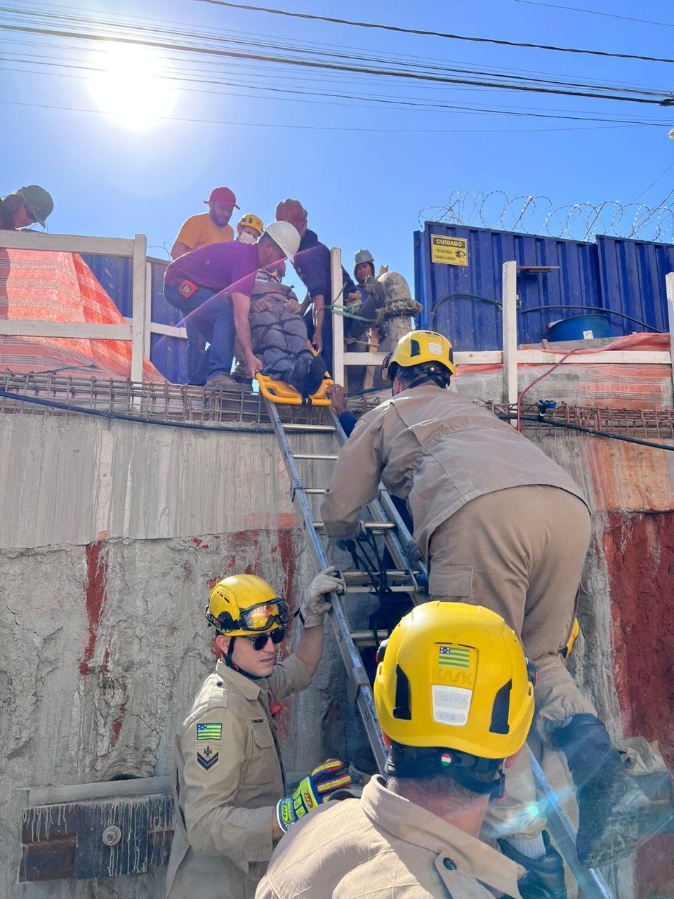 A queda foi de cerca de 2 metros. Utilizando técnicas de salvamento terrestre, a equipe conseguiu resgatar a vítima que foi encaminhada ao Hospital de Urgências de Goiás (HUGO). O trabalhador estava consciente, apresentava algumas escoriações pelo corpo e estava com suspeita de fratura na escápula.