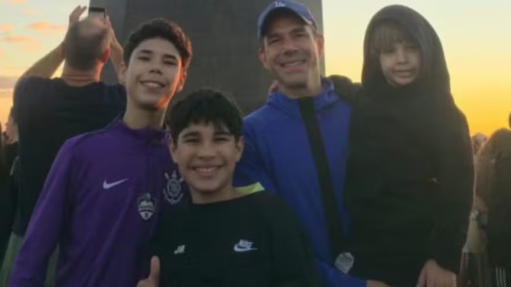 Marcus Buaiz, de 45 anos, publicou um registro especial, nesta terça-feira (8), em que mostra um passeio no Cristo Redentor, no Rio de Janeiro, ao lado dos filhos José Marcus, de 13 anos, e João Francisco, de 10, e do enteado, Rael, de 6.