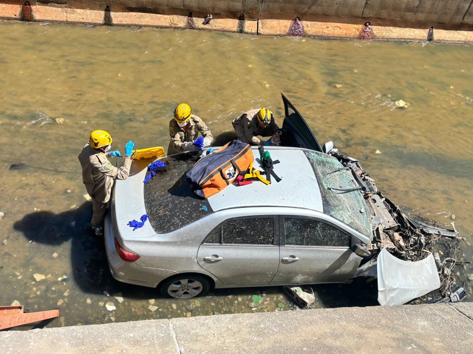 Mulher perde controle de carro e cai no Córrego Pirapitinga, em Catalão. Foto: Divulgação/10º BBM Catalão
